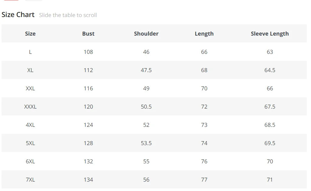 size_info: {"sizeInfoList":[{"length":{"cm":"108","inch":"42.52"},"size":"L","vid":-2},{"length":{"cm":"112","inch":"44.09"},"size":"XL","vid":-3},{"length":{"cm":"116","inch":"45.67"},"size":"XXL","vid":-4},{"length":{"cm":"120","inch":"47.24"},"size":"XXXL","vid":-5},{"length":{"cm":"124","inch":"48.82"},"size":"4XL","vid":-6},{"length":{"cm":"128","inch":"50.39"},"size":"5XL","vid":-7},{"length":{"cm":"132","inch":"51.97"},"size":"6XL","vid":-36},{"length":{"cm":"134","inch":"52.76"},"size":"7XL","vid":-37}]}